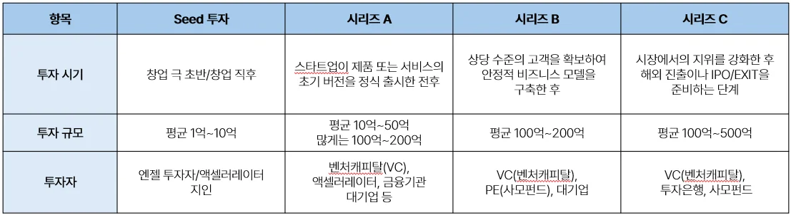 스타트업 투자는 보통 ‘시드 투자(Seed)- 시리즈 A(Series A)- 시리즈 B(Series  B)- 시리즈C(Series C)’ 단계로 진행됩니다. IPO(기업공개)나 M&A를 통한 EXIT을 하기 전까지 투자 유치가 계속되는 경우 시리즈 D, E, F 로 라운드가 추가되기도 하며, 각 라운드 사이에 프리 A, 프리 B와 같이 중간 단계의 라운드가 추가되기도 합니다. 각 투자 라운드별로 투자를 유치하는 시기나 규모가 다르기 때문에 우리 스타트업의 사업 현황이나 성장 가능성을 예측하여 투자를 대비하는 것이 중요합니다.