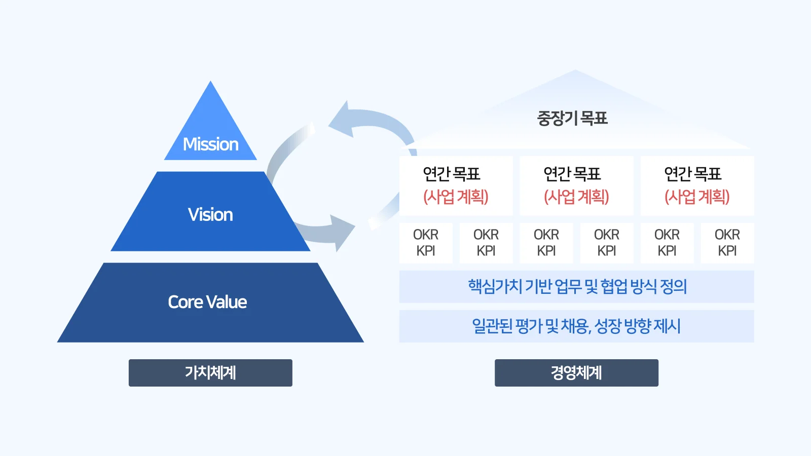가치체계(사람을 움직이는 힘): 미션(Mission), 비전(Vision), 핵심가치(Core Value)는 우리 조직이 존재하는 이유이자 나침반입니다. 이는 동일한 결과물도 다르게 해석하게 만드는 힘이 있으며, 인재와 자본이 우리라는 플랫폼에 올라타게 만드는 강력한 서사가 됩니다.
