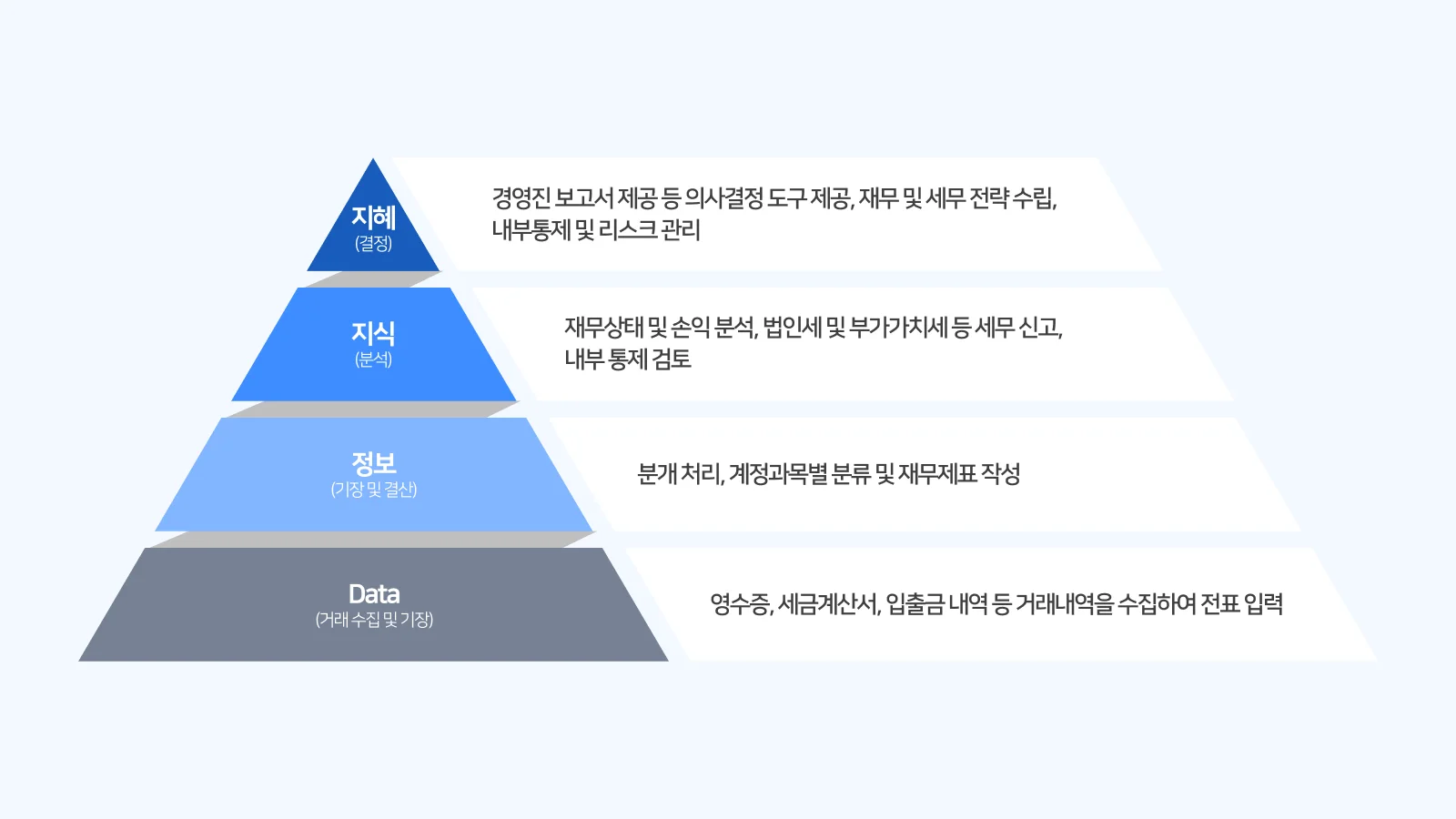 지식 | 정보를 분석해 패턴·관계 이해 | 규칙·원리 도출, 응용 가능 |
