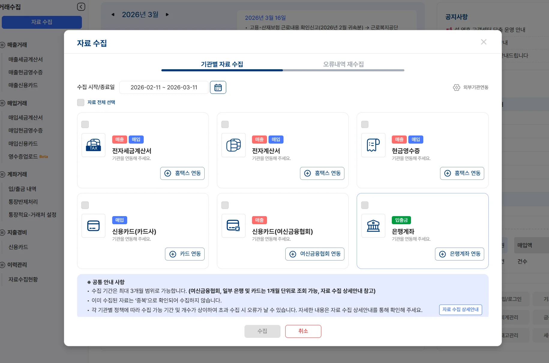 은행 거래 내역, 세금계산서, 법인카드 정보를 자동으로 수집합니다. 인공지능이 거래 내역을 분석하여 적절한 계정과목을 추천해 주므로 입력 오류를 최소화할 수 있습니다.